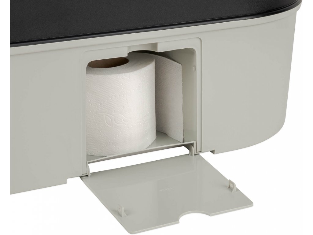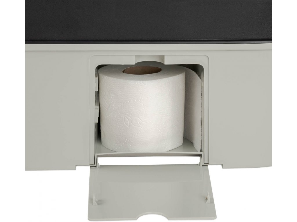 Praktická přihrádka na toaletní papír na boku odpadní nádrže zvyšuje komfort při používání. Madla na obou částech toalety umožňují snadné přenášení a manipulaci. Kompaktní rozměry (44 × 37,5 × 46,5 cm) a nízká hmotnost (4,5 kg) usnadňují skladování i přepravu v autě, karavanu nebo stanu.