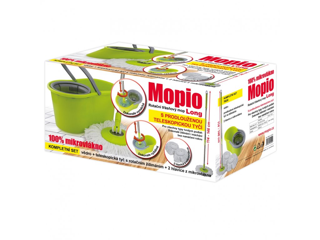 Profesionální pomocník pro snadný a rychlý úklid – Mopio Long kombinuje rotační technologii, teleskopickou tyč (až 137 cm) a mikrovlákenné hlavice, které dokáží absorbovat nečistoty i vlhkost bez zbytečného namáhání. Díky praktickému kbelíku s ždímacím mechanismem (objem 6,1 l) už nikdy nebudete muset ručně vyždímat hadr – stačí pár otáček a třásňový mop je připraven k dalšímu použití.