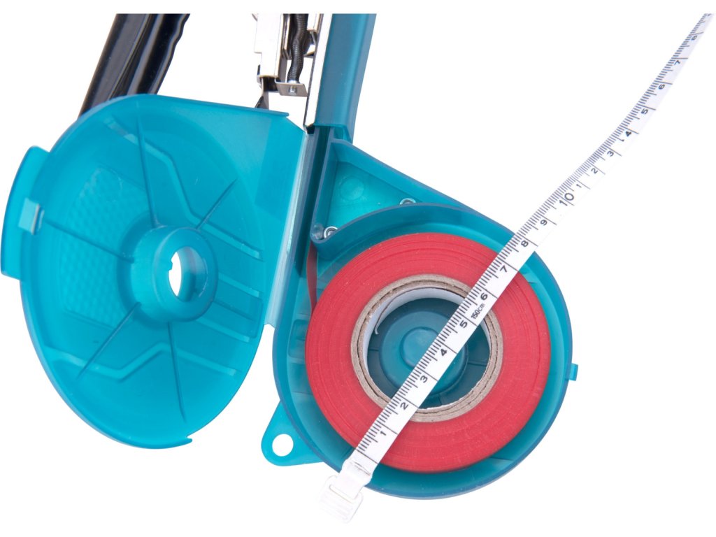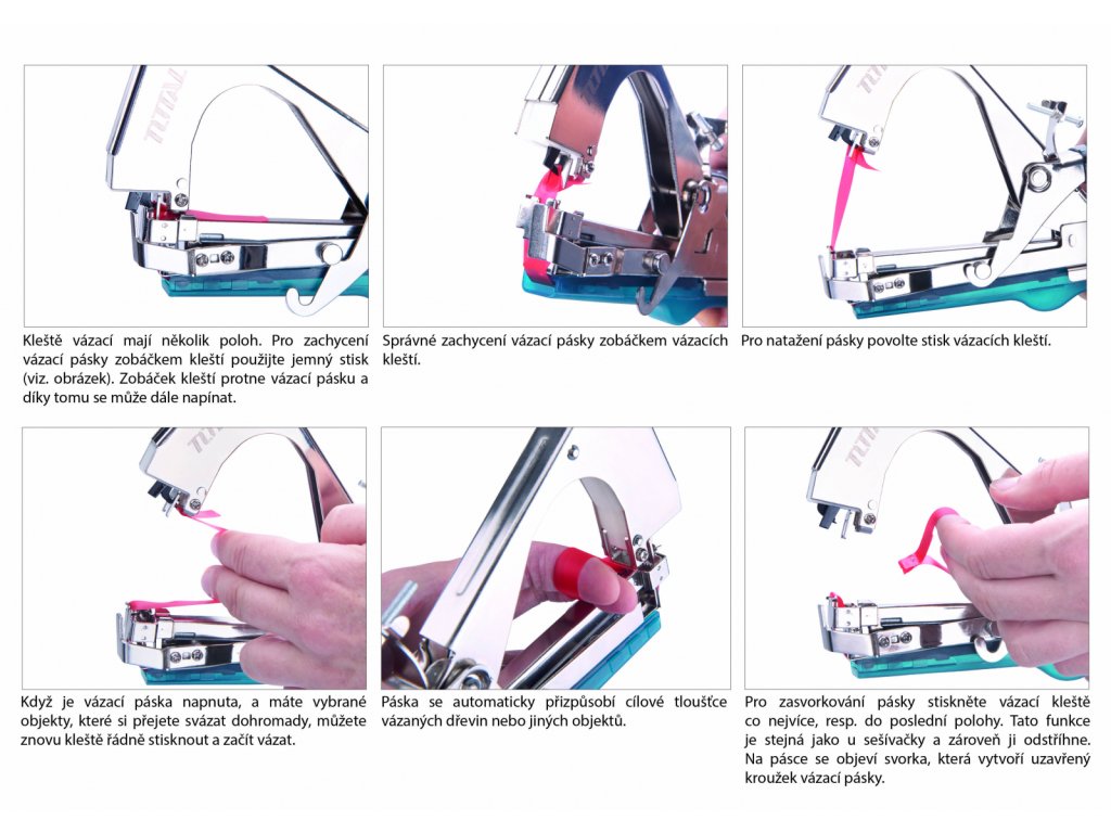 - První stisk: Silně stiskněte vyvazovací kleště, aby se páska sponkou upevnila kolem rostliny a zároveň se odřízla přebytečná část.