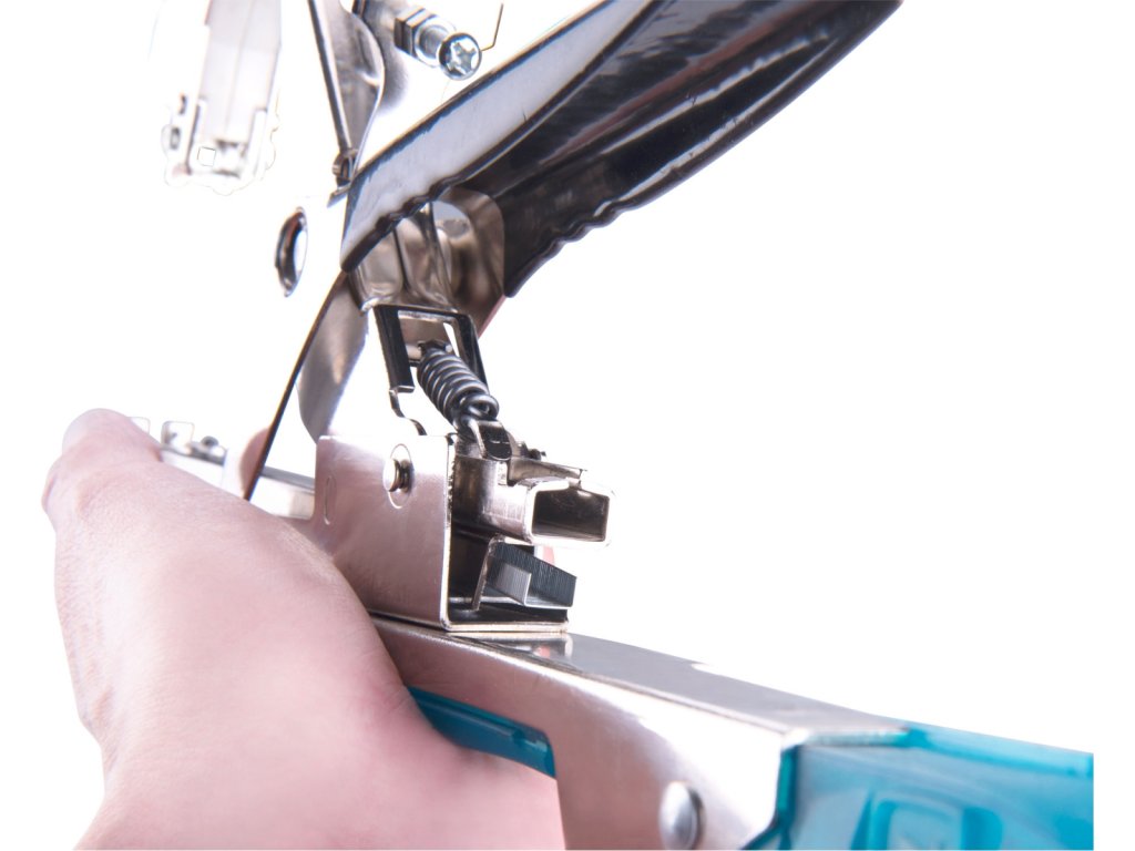 - Druhý stisk: Jemně stiskněte kleště (ne úplně nadoraz), abyste pomocí háčku mezi čelistmi znovu natáhli pásku pro další použití.