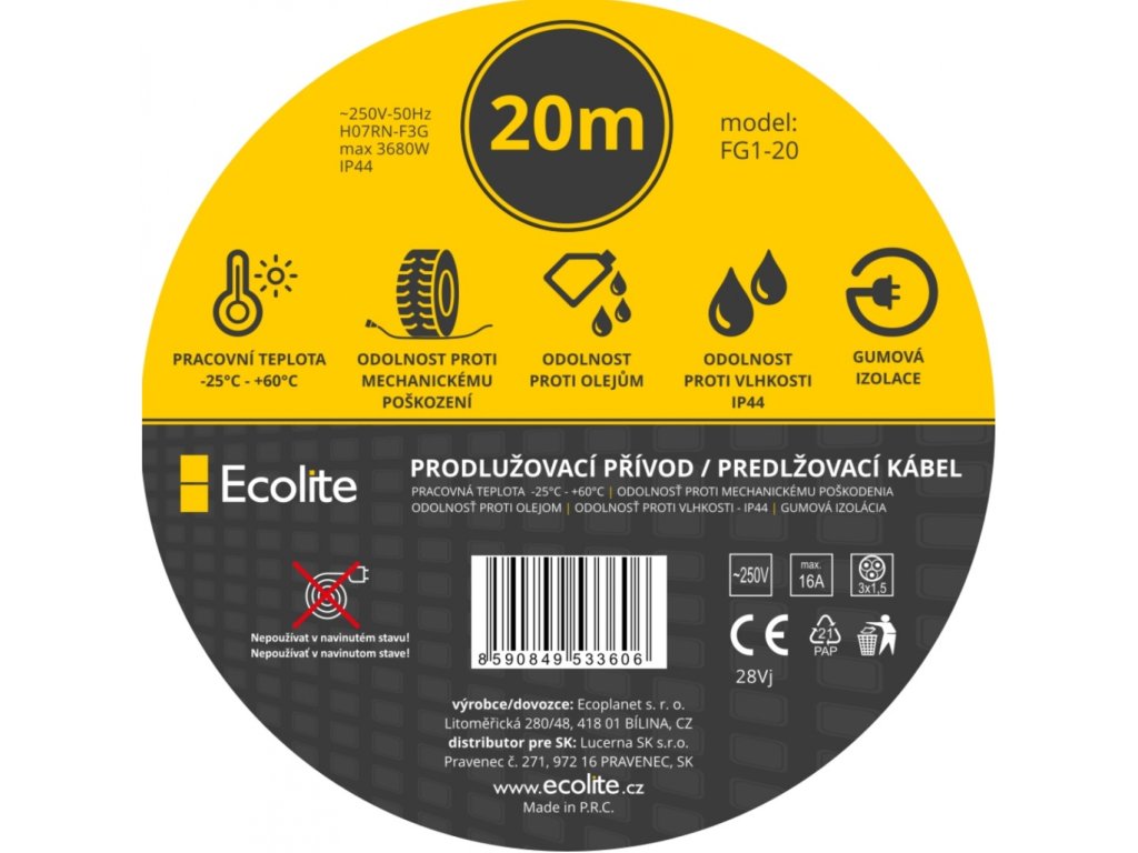 - 1× Venkovní prodlužovací kabel 20 m (IP44, 16A, 3×1,5 mm²)